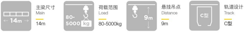 該產(chǎn)品為鋼質(zhì)結(jié)構(gòu),起重量在75kg-2000kg之間,主梁總長可達(dá)14m(可選鋁制主梁);